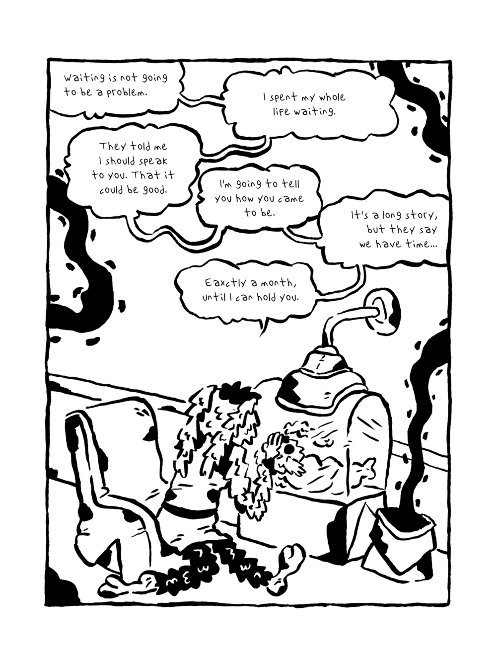 In some alien planet, someone just had a baby. As they wait for the baby to be able to get out of the incubator, they tell stories. Waiting is the only way for time to pass.